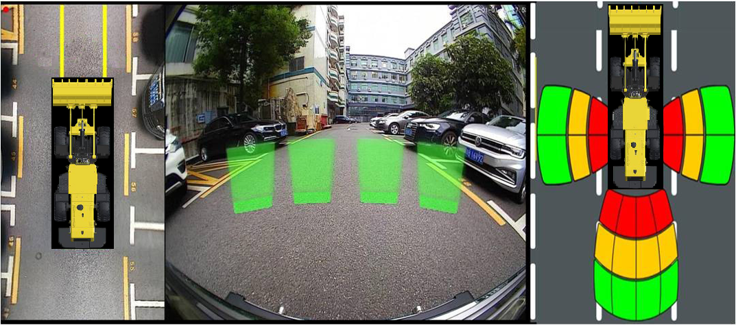 车载显示屏:实时显示360°全景图+单摄像头特写画面,危险目标用红框/图标标注,并显示距离信息。